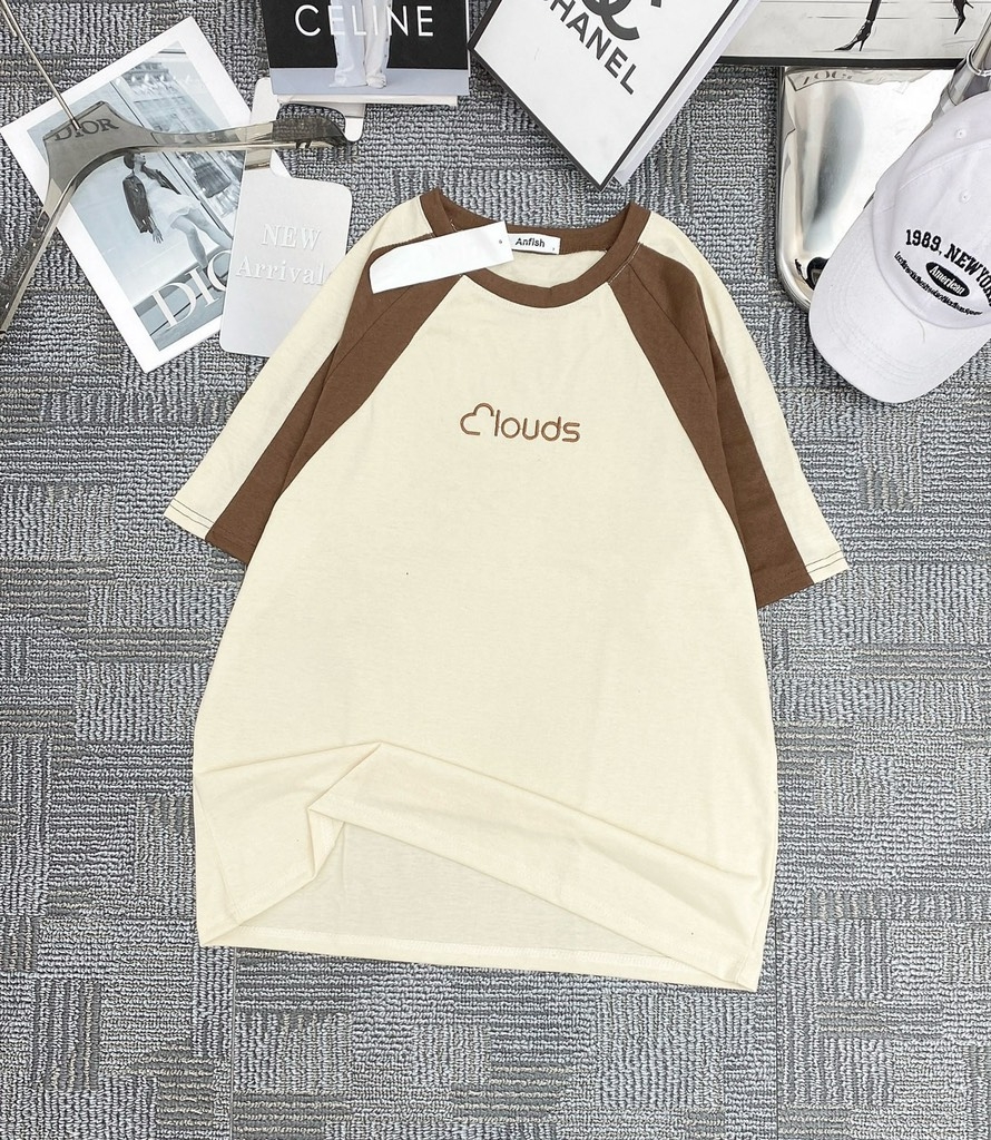 Áo thun cổ tròn phối màu nâu be thêu hình chất cotton tàu dày dặn đẹp, hàng loại 1 các ce yên tâm !