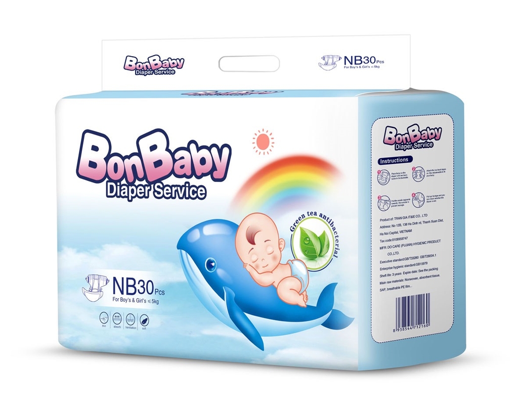 - Mỗi bịch tã dán Bonbaby cá heo size NB có 30 miếng (Ngoài ra để tiết kiệm hơn, các mẹ có thể lựa chọn NB96 với 96 miếng/bịch)