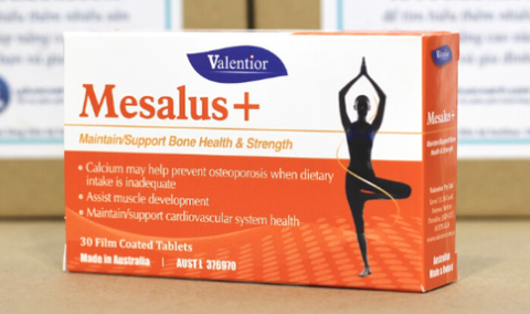 MESALUS (30 viên) Trong 2 viên thành phần chứa: Canxi carbonat 1160 mg (tương đương Canxi-464 mg) Magiê oxit 199,2 mg (tương đương Magiê-120 mg) Hydroxyapatite 171,4 mg (tương đương Phốt pho-15,44 mg; Canxi-36 mg) Menaquinone 7 (vitamin K2) 90 mcg Colecalciferol 12,5mcg (tương đương vitamin D3-500IU)