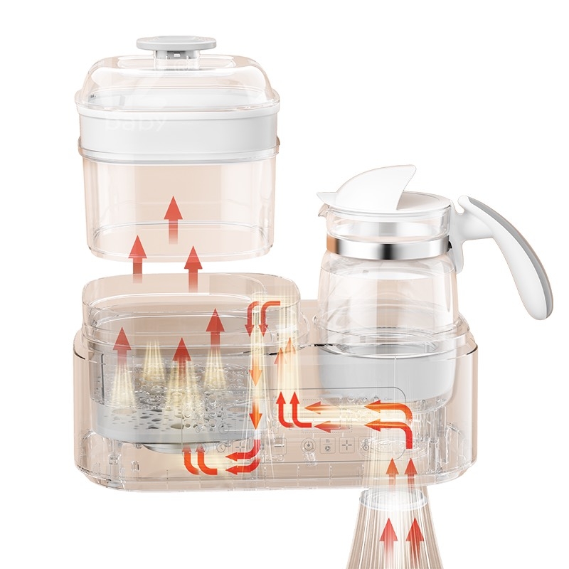 Dễ sử dụng với các nút điều khiển cảm ứng và điều khiển đèn LED – 8 chế độ làm việc: Tự động/ Tiệt trùng/ Sấy khô/ Bảo quản/ Hâm sữa/ Hầm thức ăn/ Làm sữa chua/ Hấp thức ăn