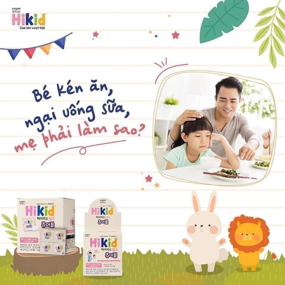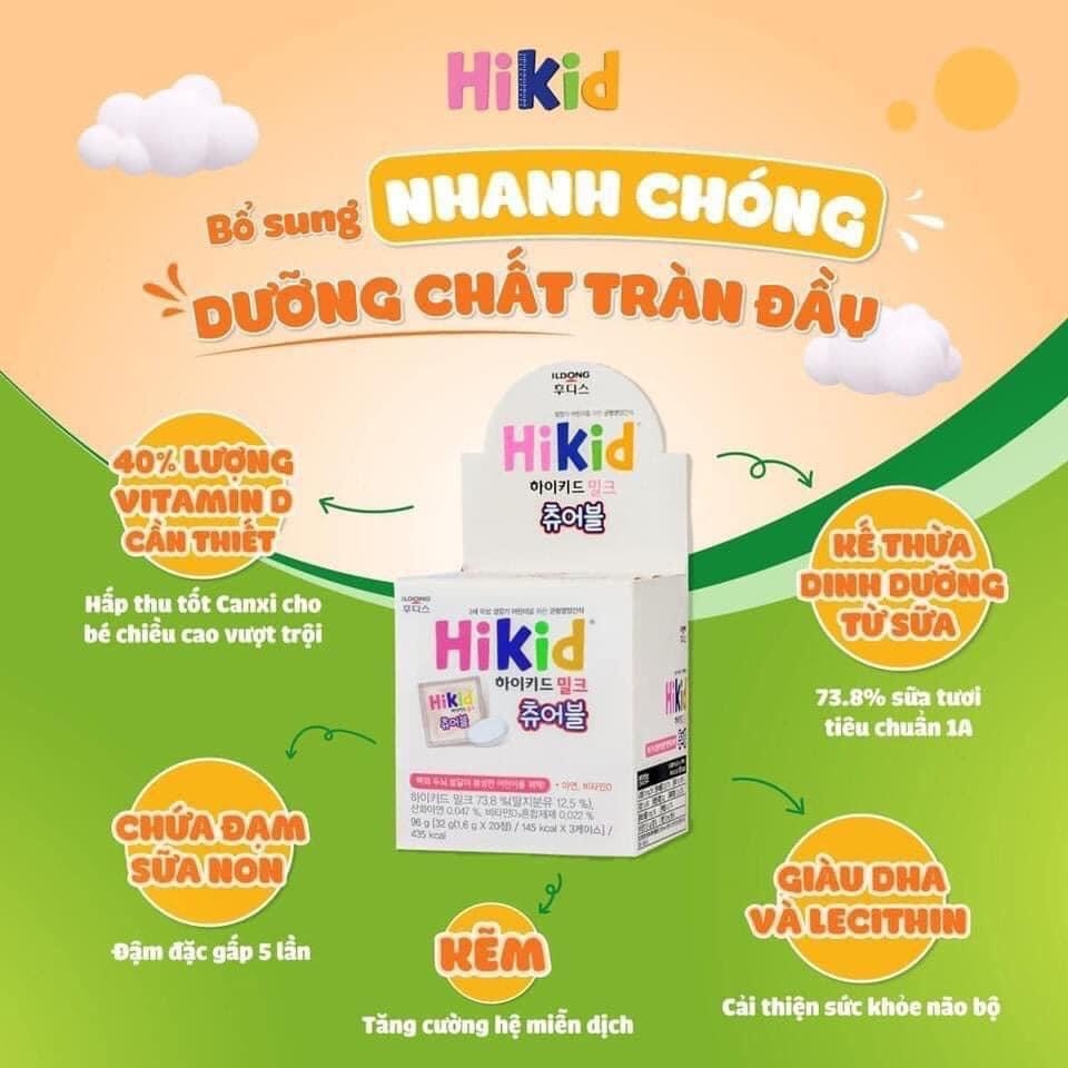 - Sữa Hikid Milk Chewable dạng viên kẹo cung cấp đầy đủ dinh dưỡng thiết yêu cho trẻ, giúp trẻ phát triển tốt nhất.
