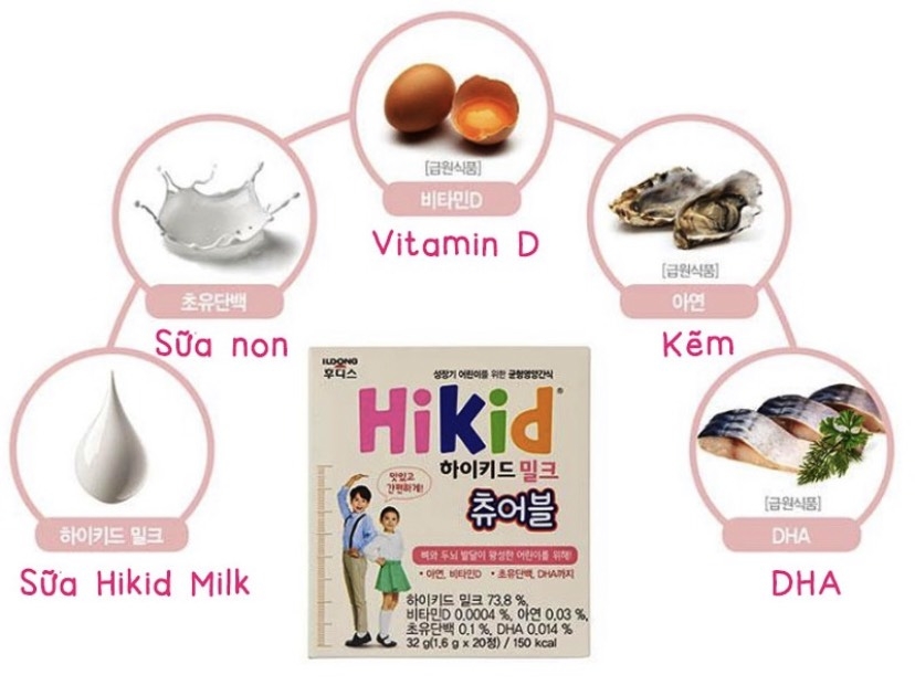 Hikid Milk [Công thức dự án chiêu cao (chưa DHA), sữa bột tác kem, bột Whey, lactose, đường fructose tinh luyện]; Hỗn hợp đường sữa lactose (đường sữa lactose, dextrin), magie stearate, bột sữa non, oxit kẽm; Công thức hỗn hợp vitamin D3 dạng bột ( gum acacia, đường, tinh bột, chất béo đã qua xử lý, silicon dioxide, vitamin D3, vitamin E).