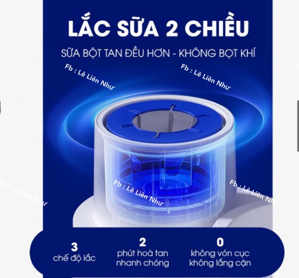 - Tự động lắc sữa đều 360 độ với 3 chế độ cài đặt thời gian khác nhau 1p-3p-6p tuỳ theo độ tan của sữa, giúp các mẹ pha sữa hoà tan tốt hơn, sữa tan đều không bị vón cục, đọng cặn, không bị tạo bọt khí trong sữa giúp bé tránh bị đầy hơi