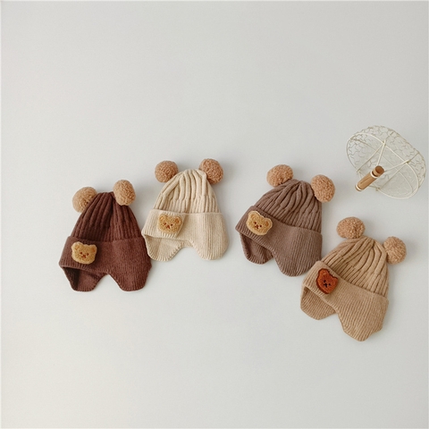 Mũ/Nón len cho bé chùm tai ấm áp, đính hình gấu hai quả bông màu sắc dễ thương, từ 5 tháng đến 3 tuổi