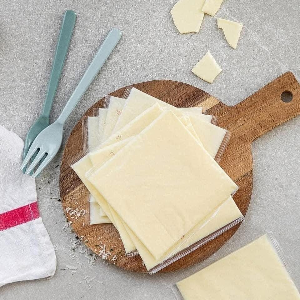 Phomai mềm từng miếng dẹt ăn trực tiếp, không bị bết dính hay dễ nghẹn như phomai cục.